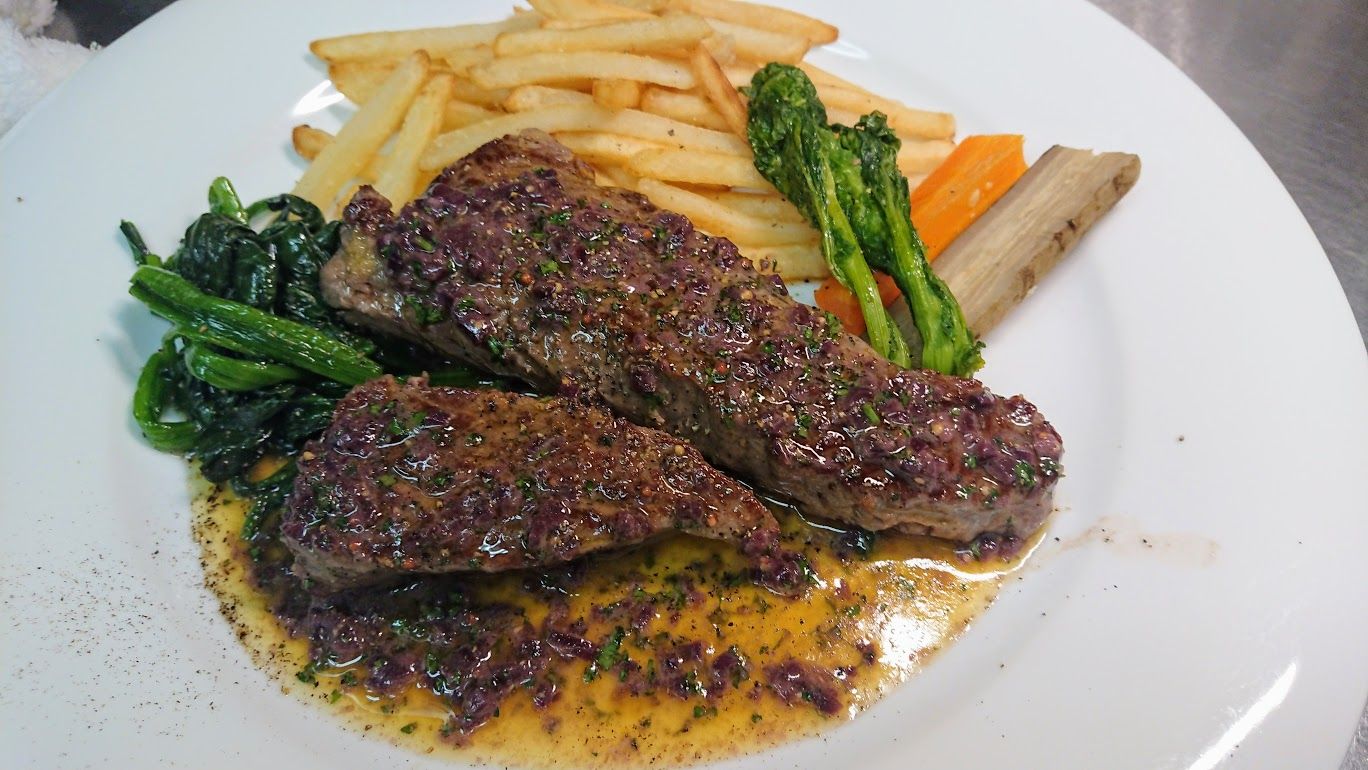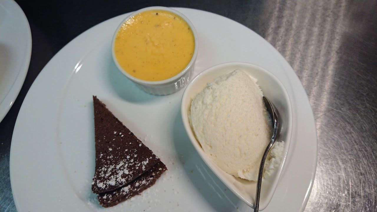 バヴェットステーキ バヴェットという部位はフランス人が一番好むステーキ肉で、パリにはバヴェットの専門店があるくらいです。牛1頭で5キロくらいしか取れない希少部位です。ヒレ肉的な柔らかさとサーロイン的な旨味があって、適度な噛み応えがあり赤身ながら少しサシが入っているのでコクもあります。ソースは、Beurre Marchand de vinブール・マルシャン・ド・ヴァンです。エシャロットの微塵切に赤ワインボトル1本を入れてセック(なべ底に張り付くくらい)に煮詰めたものを1キロのバターに合わせ、パセリの微塵切と粒マスタードや塩で味を調えたものです。これもまた当然赤ワインに合いますね!そして、付け合わせはやはりポムフリット(ポテトフライ)ですよね。パリのビストロならこの3~5倍くらい付けてきますけどね! Desserts du jour 本日のデザート盛り合わせ デザートは夜定番の盛り合わせです。(お昼にご予約されてもこのデザートになります)ベルギー産のカレボーのショコラで作ったガトーショコラ、ヴァニラのプリン、蜂蜜とミルクのソルベですね。サンク・オ・ピエ一番人気の盛り合わせです。