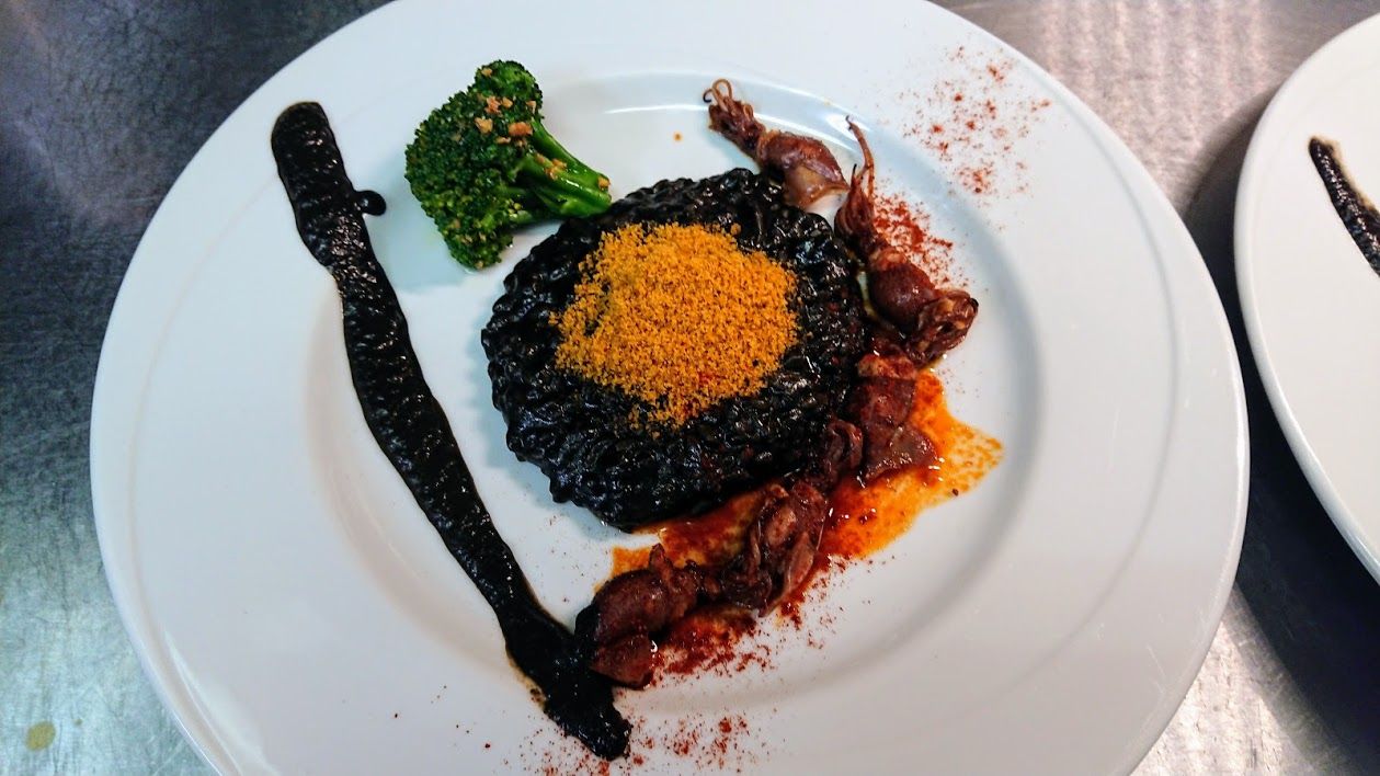 3皿目は、イカ墨リゾットに黄金色のキャビアともいわれるボッタルガ(サルディニア島産のカラスミ)をたっぷり添えて、旬の富山湾のホタルイカをガリシア風の味付けで、、これがまた美味いんです!イタリアンやスペインの料理人には悪いですが、私は自分のイカ墨料理より美味しいの食べたことがないです。先日も常連のお客様に「シェフ、何してくれちゃうの!」と言われました。(笑)これには、2000年以上の歴史を持つ畑からのコトー・デクサン・プロヴァンス・ブラン・キュヴェ・トンプル、シャトー・バの白ワインがばっちりです。