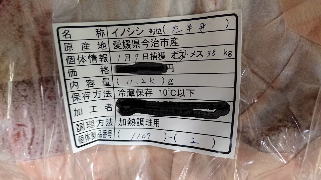 愛媛県産のミカンイノシシ入荷しました。骨付き半身です。明日、骨切り用ののこぎりが届くので、明日解体します。