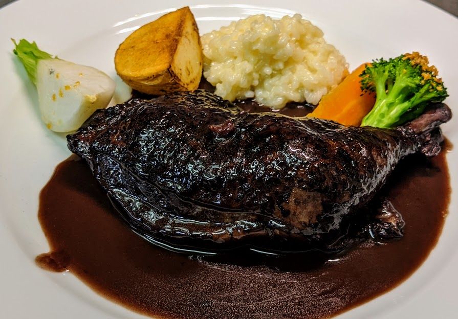 鶏を少しの野菜と赤ワインだけで煮込んで、その煮汁がソースになります。別に鶏の出汁やフォン・ド・ヴォーなどを入れる人もいますが、それだと重くなるし、第一味がピュアじゃなくなりますね!コクがあるけど軽くてくどくない煮込みが好きです。これは、ブルゴーニュが合いますね!鹿肉用のメルローも合いそうだし、お店のハウスワインの赤を使っているので、そのワインも間違いなく合いますね!これは、あと8人前あります。こんな風に、肉よりワインのほうがコストがかかってしまう料理なので、たまにしか作りませんよ。(笑)ソースが美味しいので、リゾットを少し添えます。
