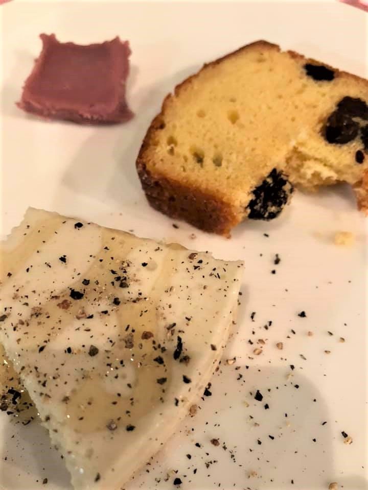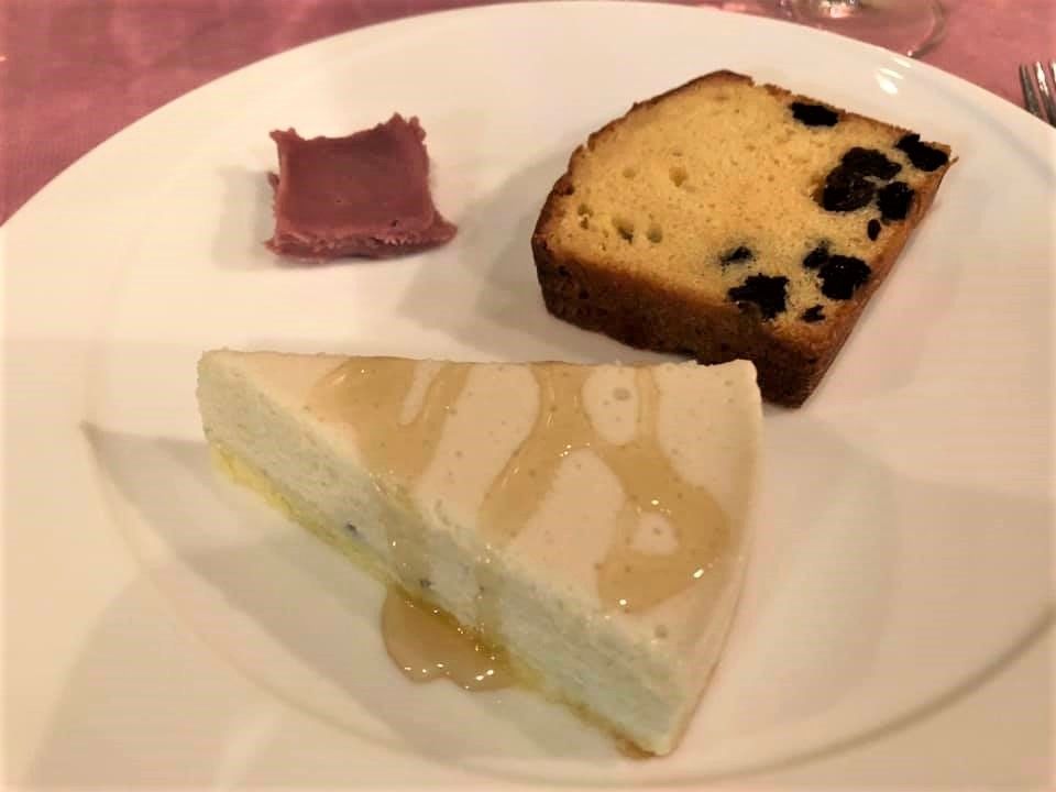 ゴルゴンゾーラ・ピカンテのムースに蜂蜜、貴腐ワイン漬けの巨峰のレーズン入りケーキは焼き上がりに貴腐ワインをたっぷり浸み込ませてあります。後、ルビーチョコの生チョコ。