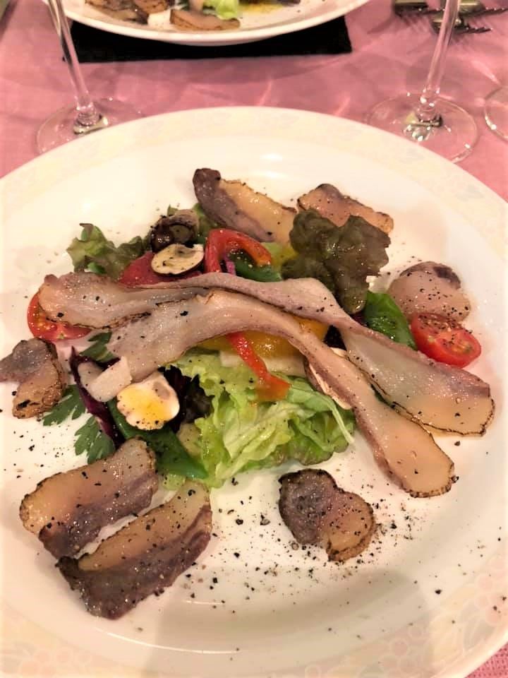 アナグマのサーロインのスモークの炙りと長い肉がイノシシのパンチェッタの炙り、サラダ仕立て。