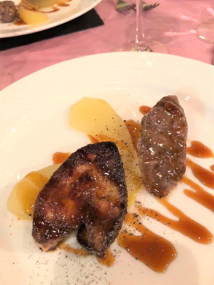 フォアグラのソテーとイノ鹿皮無しソーセージにリンゴのコンポート添え、リンゴのバルサミコ、バルサメーラのソース。ここまでのワインが、、