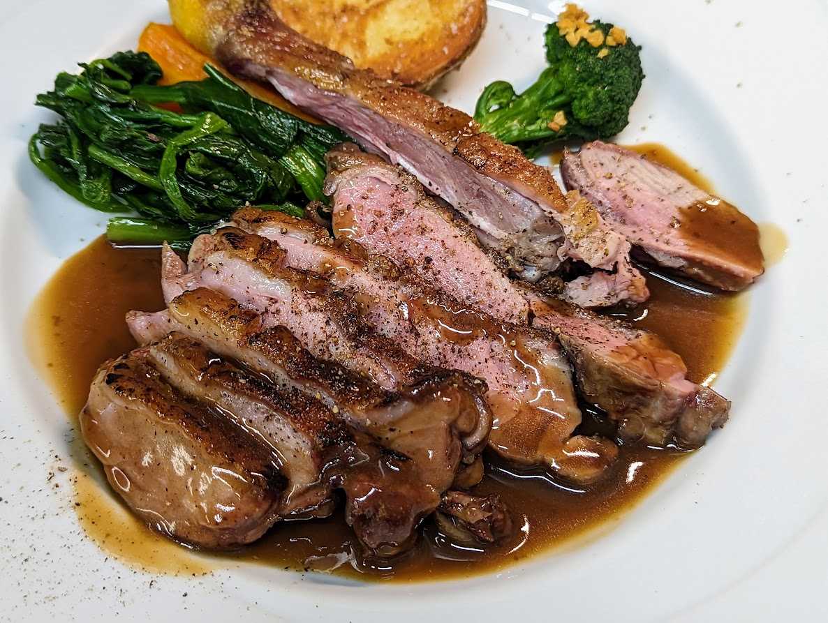 シャラン産窒息鴨のモモ肉のローストです。フランスの鴨はもう1年以上輸入が止まっているので、胸肉は持っている業者がない状態です。モモ肉はやや人気がないので、まだ少し持っている業者がいてうちの在庫はあと3本。これで多分次はないです。このメニューは2001年にサンク・オ・ピエが開業したころの大人気メニューでした。当時一緒にやっていた、ソムリエの高山氏に試しにこの鴨を焼いてみたら、いたく気に入って、「これは売り物になる!」ということでメニューに載ったんです。当時私は千葉の業界で「仔羊焼きの名手」と言われていたらしいんですが、、、自分としてはむしろ鴨や鳩やウズラといった鳥系が自信あったんですけどね、、。鴨のモモ肉は焼き過ぎると固いのですが、レアすぎても気持ち悪いので、ちょうどよく焼くしかないので結構難しいんです。まあ、ちょうどよく焼くだけのことなんですが、それがね、、。