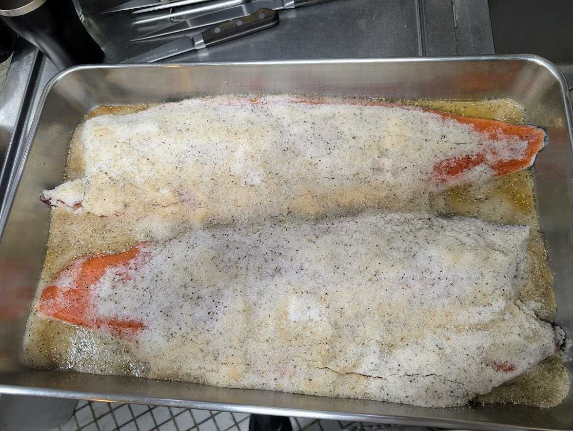タスマニア産のサーモン、4.3キロくらいで約70cmくらい。これをカマをつけたままおろして、、 塩の敷布団(シチリアのトラパニ塩田の塩にキビ砂糖を少しと粗挽き黒胡椒とプロヴァンス風ハーブ、マジョラム、バジル、オレガノ、タイムのミックスね) サーモン並べて、塩の掛布団ね! これで24時間漬けて、桜のチップで8時間燻すよ。30度以下の煙を使うので、サーモンの身には火が入らないので、しっとりした極上スモークサーモンになるんだな!美味いよ! スモークかけているところは、また次回に、、。