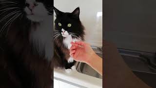 # 2413午後になると西から日が差し込んで台所の床に影ができるようになる。流しで何かしていると、床の反射が壁に映ってチラチラ動くのでそれをめがけてくーちゃんが突進する。次また動いたらつかまえなきゃ、とここで待機しているくーちゃん。スポットライト状態のくーちゃん。白黒が強調されてくーちゃん自体がアートみたい。しゃがんでくーちゃんを撮っていると影がちーとも動かないのでつまんなくなってきたくーちゃん。結局、待ってるの飽きてこっちに寄ってきたので一緒に写真撮ってみた。- - - - - - - - - -さてー2年前の赤ちゃんくーちゃん。おかえり17日目。 → ティッシュを一枚 ティッシュと並ぶくーちゃん。この2枚は、暗かったりピンボケだったりちょっとイマイチだから載せてなかった写真。ひざの上の仰向けくーちゃん。2020年11月9日の写真。- - - - - - - - - -おっきいくーちゃんの写真・・・、なんと、11月9日という日は、15年のうち、どの11月9日もくーちゃんの写真を撮ってなかった!なので今日はお休み。どうでもいい小籠包の写真はあったんだけど。にゃはははは。- - - - - - - - - -ランキングサイト参加中 LINEスタンプ Tシャツとか 買ったものと欲しいもの