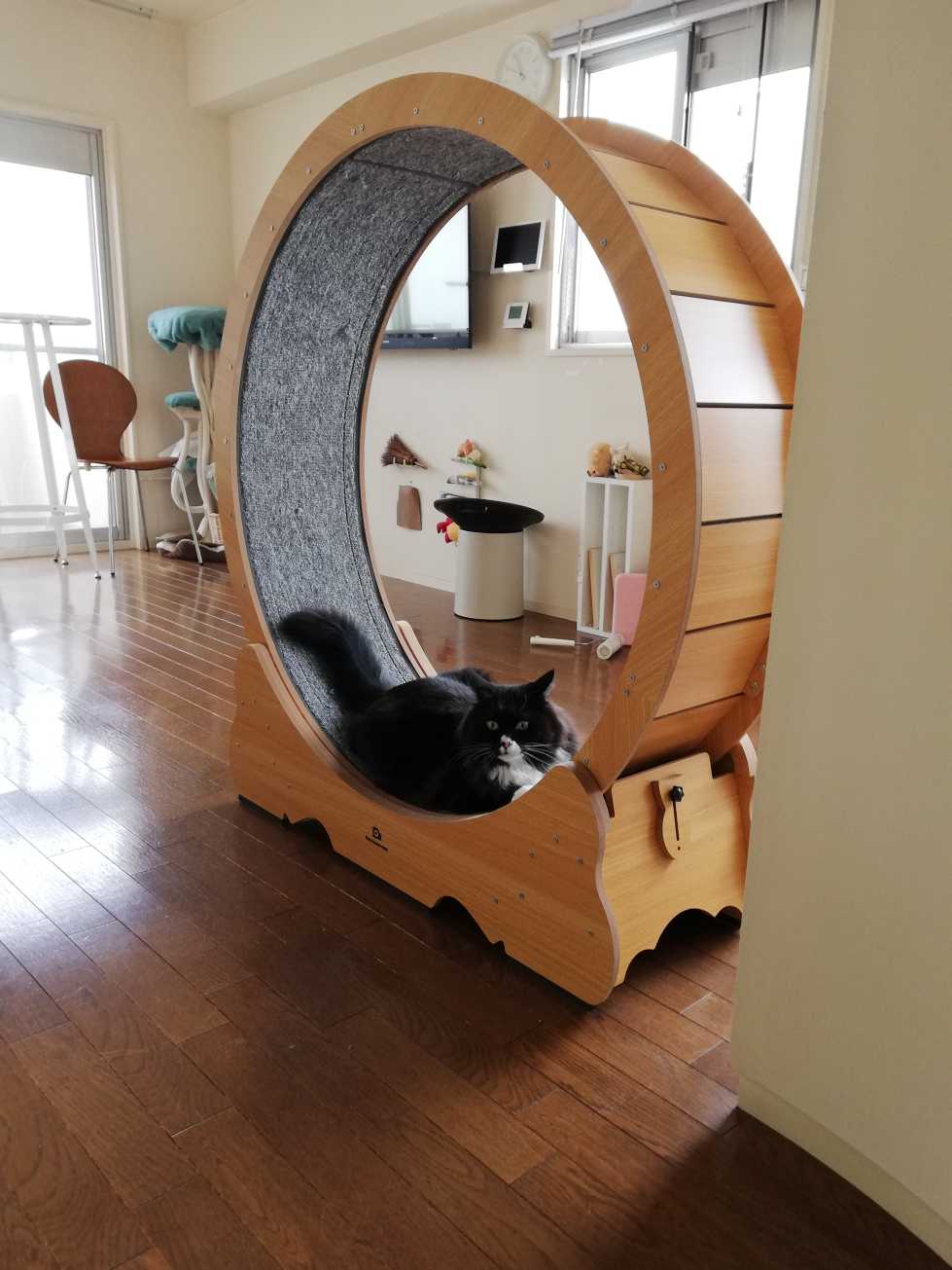 # 3428 (10/15)朝から家具の大移動が始まって、くーちゃんのホイールも向きが変わった。給湯器の交換工事をしてもらう日なので、それに備えてスペースを空けるためにものを動かしたのだ。いつもは横向きに置かれているホイール。縦になったのは初めて。早速チェックのため乗ってみたくーちゃん。きのこタワーもここに来た。寝室に置かれている高テーブルも。これは工事の作業中、待っている間何か暇つぶしするために。これまたいつもと違う場所だからチェックのために乗ったくーちゃん。わあー、なんか高いー。遠くまで見えるー。って、うれしそうだけどそれ、いつもと高さは変わらないよ。隣の部屋と数メートルしか変わらない場所だけど何だか違う風景が見えるようでワクワクする。真剣に外を眺めるくーちゃん。首をのばして上の方も見る。立ち上がってまで何かをチェック。こうやって並べると高テーブルときのこタワーはほぼ同じ高さなのだな。だんだん予定の時間が近くなると、大人はそわそわしてきてくーちゃんも何となくのんきにしていられない雰囲気になる。何があるのか、まだわからないけどちょっと緊張気味のくーちゃん。いよいよあと数十分、という頃にはくーちゃんも何かを察知して寝室の棚の上に避難。一応、「知らない人くるからね」と言っておく。こっちの部屋はドアを閉めておくからくーちゃんは知らない人とは会わないけど、まぁ一応万が一に備えてヒモヒモ(ハーネス)は着てもらっている。きっと物音や話し声を聞いたら、ここからは絶対に降りてこないのだけど。あと少しで到着すると連絡があった。買っておいた給湯器を持ってきた。今回、給湯器は自分でネット購入して、取り替えの工事だけを依頼した。最初は、大手の工務店とか給湯器専門の業者とかいろいろ検討したのだけどどうにもこうにも高くつく。給湯器自体もそこそこの値段なのに、それ以上に工賃がかかる。セットでお願いすると最低でも8万円台だった。うーん、給湯器だけならネットで安く買えるのに。そこで「くらしのマーケット」というサイトで工事だけやってくれる業者さんを探して、日時の都合や金額とかあとは「なんかよさそう」と思う人を選んでお願いすることにした。メッセージのやり取りだけで工事依頼が完了。給湯器の工事料金は1万5千円が相場なようだ。安い。そんなわけで個人でガス機器工事業を営んでいる職人さんが来てくれて、手際よく工事を進めて予定時間通りに取り替えが終わった。もともとは大手の会社にいたそうだ。「くらしのマーケット」でランキング上位の人気の業者さんなので、一日に何件も予約が入っているようで経験値はかなり高そう。室内のリモコンもセットで取り替え。リモコンの裏ってこんななってるんだ、と初めて知った。これも手際よく取り替えてくれて、あとは機器の説明を詳しくしてくれて、最後にお金を払って完了。(当日現金払いなら1000円引きというサービス付きだった。)ドアを開けて様子を見に行くと、案の定、ちぢみ上がっていた。思いっきり、出来る限り隅っこに寄って、猫ざるに隠れて(無理)耳も伏せて、特別警戒モード。もう帰ったよ。誰もいないよ。と言ったのにそれから40分ぐらい降りてこなかった。部屋の家具たちを元の場所に戻して片付けが終わったらようやく降りてきて誰かいた気配の残りと部屋の変化をチェック。よし、もとどおり。くーちゃんの部屋。= = = = = = = = = =さてー、2年前の3歳くーちゃん。おかえり1107日目。 → 毛を浸して飲んで えり毛しゃぶしゃぶくーちゃん。水を飲んで立ち去るくーちゃん。2023年11月5日の写真。= = = = = = = = = =おっきいくーちゃん。今日は、2007年。2007年11月5日の写真。 → えげれす風味 おみやげ見に来たくつした。おみやげと並ぶくつした。実は押さえつけられている。そーっと逃れようとするくつした。- - - - - - - - - -ランキングサイト参加中 LINEスタンプ Tシャツとか 買ったものと欲しいもの