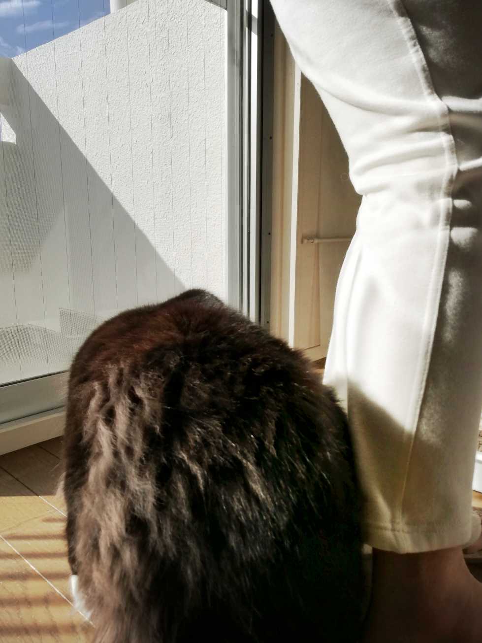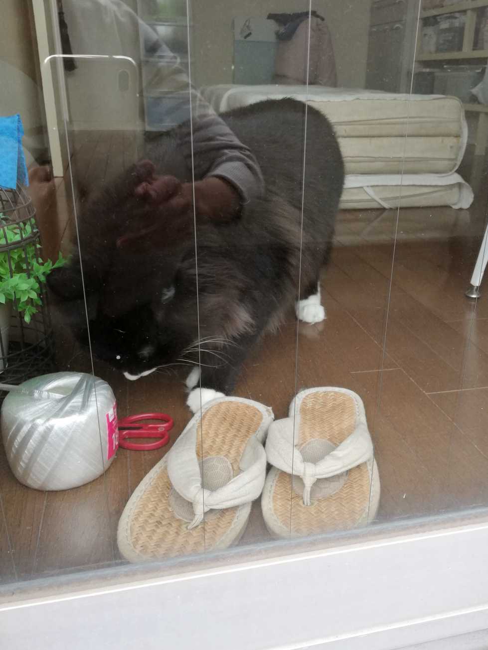 # 3432 (10/22)ベランダに突っ張り式の物干し台(床と天井に突っ張らせて好きな高さで使える竿受け)を置いていたのだけど、近年は完全に室内干しでもう外に干すことはないと思ったので竿受けも、物干し竿も全部撤去することにした。ということで久しぶりにベランダへ出た。久しぶりって、おそらく数年ぶり。くーちゃんが生まれて帰ってきてからは洗濯物をベランダに干したことはないし、おっきいくーちゃんの晩年すでに部屋干しをしていたという記憶があるからそれ以外の用、例えば飛んできたゴミを拾うとかその程度の用事で数回は出たと思うけど、あとはほとんど出ていない。ということで、ベランダに出ているところをくーちゃんが見るのは初めてかもしれない。最初は何か大変なことが始まるのではないかと持ち前のこわがりを発揮して棚の上に登ってそーーっと遠くから眺めていたのだけど、何度か出入りしているうちになんか大丈夫そう…と思ったらしく、窓のところまで見に来た。窓を開けて中へ入るときくーちゃんが出ないよう一応は細心の注意を払っているけど、くーちゃん自身は出てみたいという気は特になさそう。何してるのかなーと、不思議そうに観察している。突っ張りの竿受けは前のマンションのときに買ったもので、引っ越しでも持ってきて引き続き使っていたのだけどそう、かれこれ十数年多分 15年ぐらいは経っているので、突っ張りを固定するプラスチックのネジなんかもう劣化していてひねった瞬間、ボソッと崩れてホロホロホロ…と粉雪のように散った。仕方ないのでペンチ持ってきてどうにかこうにか解体した。分解したステンレスの棒数本をヒモで束ねて中へ運び込み、部屋を通って玄関へ置きに行く。ながーいものが通っていくのをビクビクと逃げ腰になりながらも一緒について玄関まで見に行くくーちゃん。とりあえず玄関に立て掛けておく。明日、不用品回収に出すので。見慣れないものが置かれた状況がとても気になるくーちゃん。最近は、この玄関の簡易ゲートを飛び越えるという芸当を覚えたのだ。大人の腰ぐらいの高さだからくーちゃんならまあ飛び越えられてしまう。取り付けたのがもっと小さい頃で、最近まではゲートの向こうに行く気がなさそうだったからそのままにしていた。ダメだよ、って注意してもこらーって怒っても隙を見ては飛び越えるようになってしまったので、ワイヤーネットを継ぎ足してさらに高くした。応急処置で。・・・やってみたけど、くーちゃん、これも飛び越えたのだ。しかも飛ぶときワンクッション、壁を蹴って2段階で飛び越えるから壁が爪で削られて傷だらけ。こりゃいかん。ゲートも開け閉めするときぐらんぐらんするし見た目もイマイチだし、やっぱやめたー!と、あとで元に戻した。見られてないときがあったら、飛ぼうと思っているくーちゃん。じっと見張られていて困っている。くーちゃんダメだよ。置いてある長いやつ倒れたら危ないからね。出ないよ。という素振りを見せつつでも、玄関から動きたくないくーちゃん。もう部屋に戻るよ。と、声を掛けてもしらんぷりしてついて来ない。くーちゃん、そこにいてあとで飛ぼうと思ってるでしょ。お互いに相手の動きを見張っているのだった。= = = = = = = = = =さてー、今日は写真ないので2年前の3歳くーちゃん、おかえり1112日目は お休み。代わりにこれでも見ててー。5年前のくーちゃん。 → ブリ大根(猫ごはん) = = = = = = = = = =おっきいくーちゃん。今日は、2007年。2007年11月10日の写真。テーブルの下にいるくつした。ホットカーペットで寝るくつした。ぬくぬくすやすやくつした。- - - - - - - - - -ランキングサイト参加中 LINEスタンプ Tシャツとか 買ったものと欲しいもの