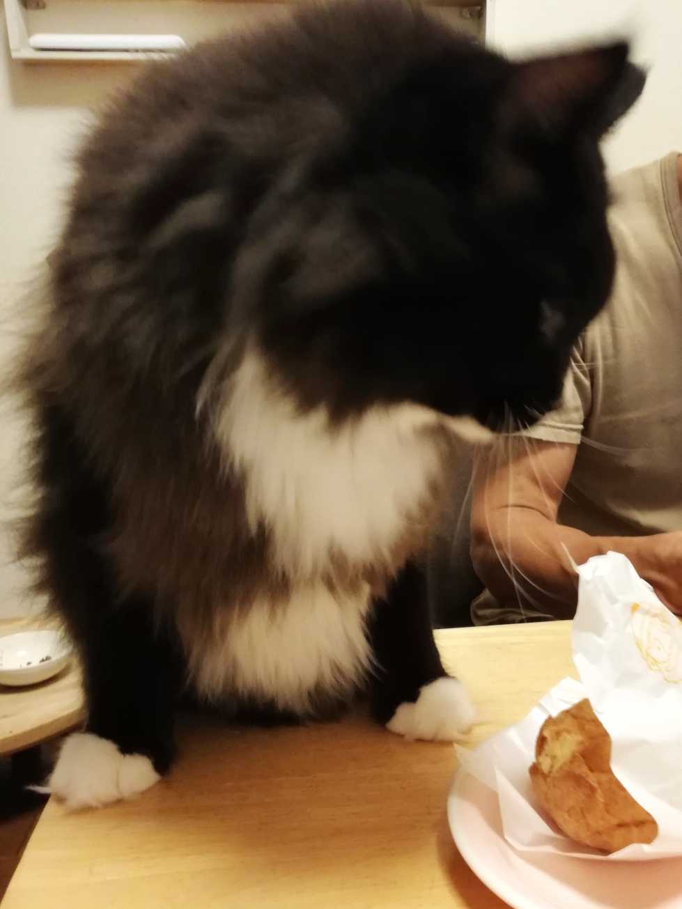 # 3429 (10/19)大人たちはまたシュークリームを買ってきた。お誕生日月のクーポンがあったのでそれにつられて、また。くーちゃんも今日はなめてみることにした。白いクリーム専門と、決めているわけじゃないけどカスタードクリームはあんまりなめたことない。食べてみたら案外おいしかった。なんだこれもうまいやつ。いっしょけんめなめてしまった。フォークがきれいになるまでなめなめ。もうひとくちもらった。おいしい。ごくごくいけそう。すぐなめ終わった。またフォークきれいにした。さらにもうひとすくい。ちょっとだったので一口でいった。でもすぐ終わるとつまらないので今度はちびちび・・・と思ったけど、おいしくてつい、ぺろんと。いかんいかん、ちょっとずつだ。とけるようにのどに消えていく。いくらでもなめられそう。こんなおいしいものだったのか。いつもスルーしてて知らなかった。今度からケーキじゃなくてもちゃんと味見してみないと。クリームなめが止まらないくーちゃん。ペロンペロン、ペロっペロっ。= = = = = = = = = =さてー、2年前の3歳くーちゃん。おかえり1109日目。 → くちゃっと箱詰まり 箱の中でよじれているくーちゃん。2023年11月7日の写真。= = = = = = = = = =おっきいくーちゃん。今日は、2009年。2009年11月7日の写真。 → 牛モモもやキャベ炒め、鶏団子鍋 【猫ごはん】 (後半部分)くつしたの晩ごはん。中身は、牛モモ肉、鶏ムネミンチ、卵、舞茸、鶏とマグロの作り置きごはん。大人は、鶏団子のカレー鍋など。食べているくつした。呼ばれて振り向くくつした。つづきを食べるくつした。- - - - - - - - - -ランキングサイト参加中 LINEスタンプ Tシャツとか 買ったものと欲しいもの