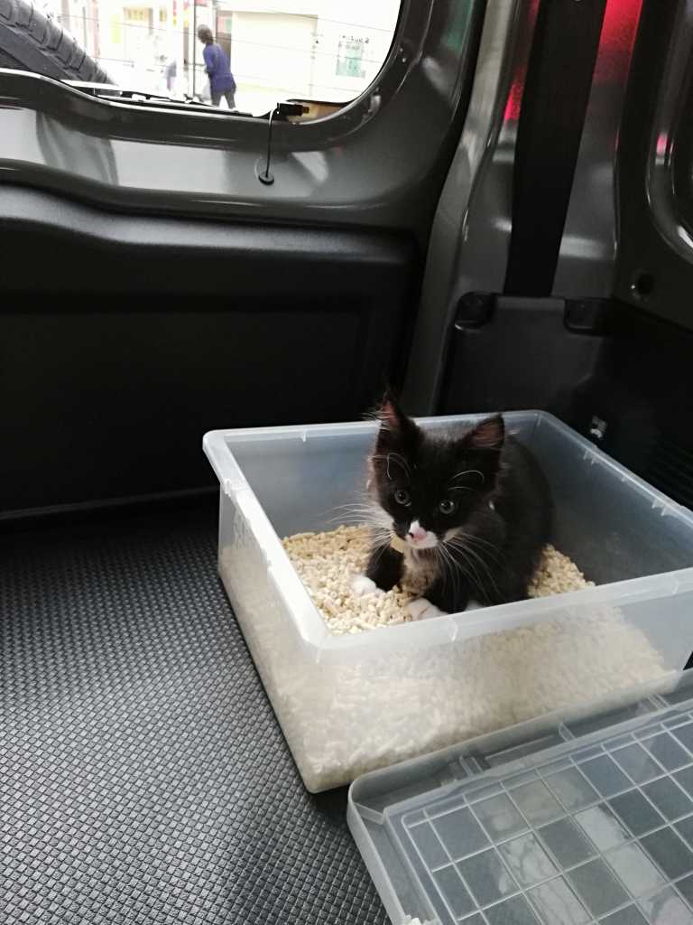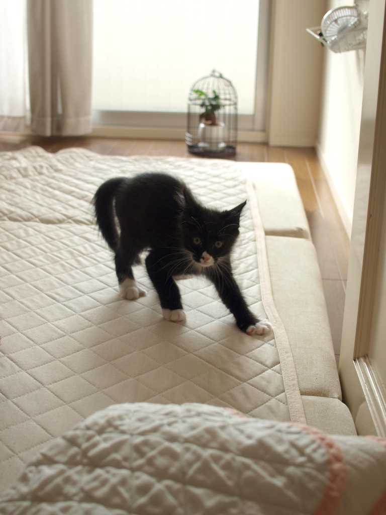 おしっこ対策のワイヤーネットの上のくーちゃん。