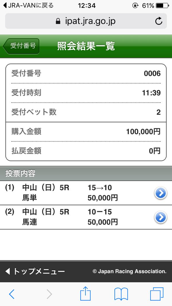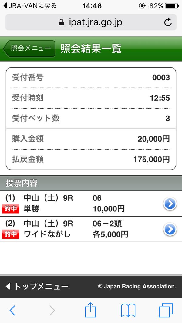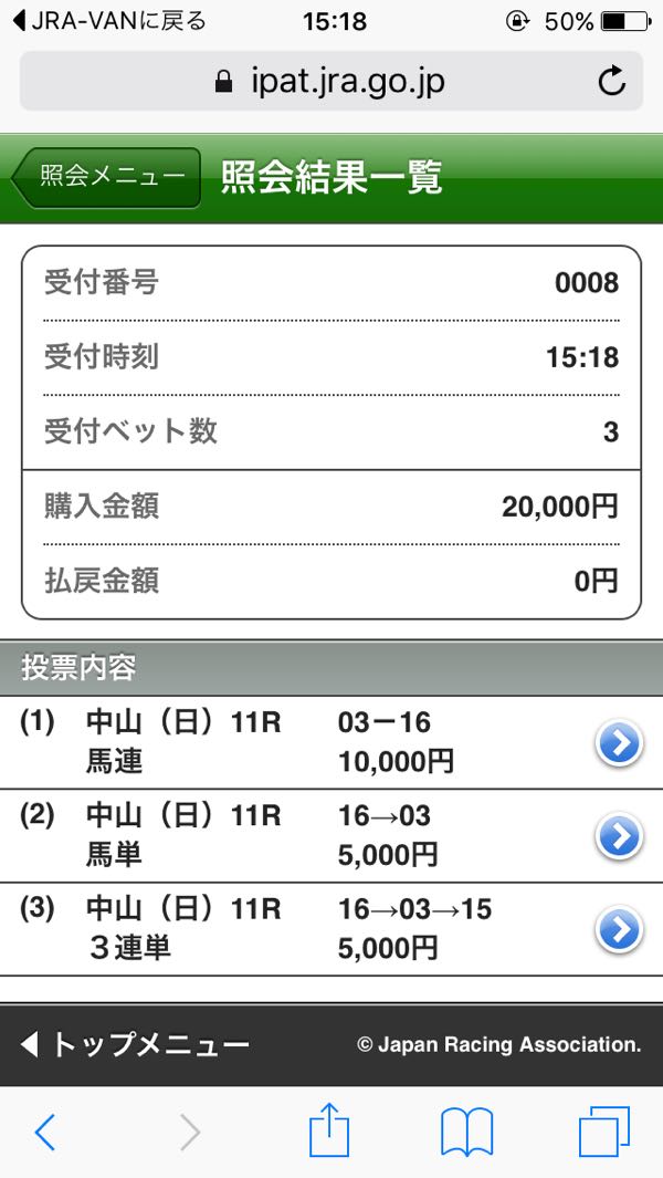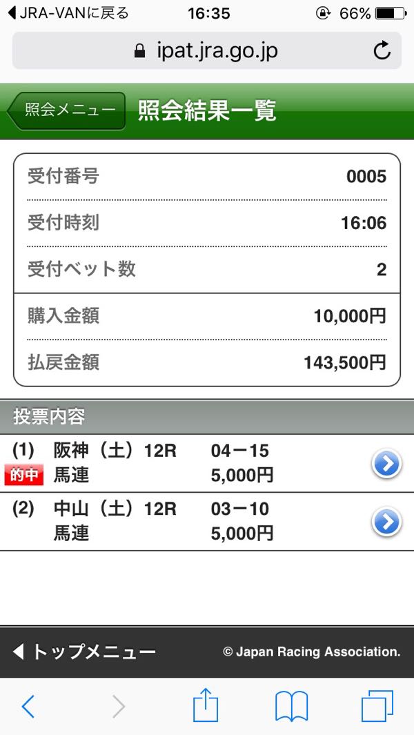 どうにか天気が持ちそうな感じ。 強く降ったら止めというのはルールなので、降り始めが遅ければなんとか… 昨日は最終でこんな馬券。 パドック見てからしか買うレース決めないのに買わない買い目を出す意味が無いなと思いますので、狙い馬だけにします。 時間さえあればゆっくり馬券選べるんですけどね〜。 中山 01R ○ハヤブサレディゴー 02R ◎ロードゼフィール 03R ○ノボホウセイ 04R ○グリントオブライト 06R ◎リュクサンブール 阪神 04R ○ジャジャウマガール 05R ▲マテンロウバッハ 06R ○フォールインラブ 福島 02R ◎パーリオミノル 07R ○イーグルアモン