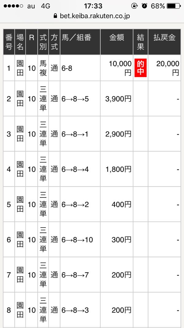 今日は良いですね。 割とタイム差通りに走ってくれているイメージです。 前半は単勝でボチボチでした。 天皇賞はゴールドアクター中心ですが、枠を考えると絶対ではないので、色々三連単で買おうかと思っています。 印は後ほど 東京 08R ○アサクサスターズ 09R ○エイシンアロンジー 10R ○トーキングドラム 京都 10R ▲エルフィルコーブ 11R ◎ゴールドアクター 新潟 08R ○ケンベストカフェ 09R ○ケルシャンス 10R ▲トウカイトレジャー