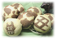 皆様、おめでとうございます!昨年はパソコン不調後、あれこれ雑用に終われ、更新できないまま、年明けしてしまいました。お陰さまで自然治癒?!したのかしら?なんとか入力できてます。ヨカッタ、ヨカッタ^^昨年はかなり慌てん坊モカでいつも時間に追われている感じでした。今年は丑年。牛といえば・・・草原で尻尾フリフリしながらノンビリと草食べているのどかなイメージ(笑)(すでにオバハンですが)大人の女性として何事にも落ち着いて対応できるようゆったり・ノンビリとした気持ちで過ごしたいと思います。2009年もどうぞよろしくお願いします。大晦日にパンレッスンの復習ホシノ天然酵母を使ってメロンパン、シュトーレン、抹茶大納言で焼き納め。メロンパンは2009年の干支である牛柄で遊んでみました。でもC子は「キリンパン、たべるぅ~」ですってお家でもおいしく焼けて大満足でした。大晦日→お正月と食べてばっかりで体系も牛になりそう 気をつけなくっちゃ