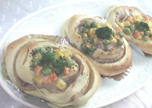 ハム&mixベジタブルパン先日無塩バターを切らして買いに行ったら珍しくどこも売り切れお店の方も「普通のバターと同じ感覚で使用できます。」との言葉に仕方がなく、バターとマーガリン半々のデリシャスコンパウンドを購入家に帰ってよくよく見たら食塩入ってるー材料の塩2g程度減らしてコネコネ。無塩バターの時よりもなんか香りがする~しかもなかなかいい感じに捏ね上がらない~でも、なんとか焼けました半分は中心にアスパラとハムを巻き込んだロールパン。慣れない事するから今回の成形はヒドイ姿味はバターonlyよりもかなりあっさりめ。上のマヨ&ベジタブルが乗っているのにマヨ足りなかった?と感じるほど。カロリーも半減できたのかな?焼きたてなので形も味もなんとかごまかせたモカでした。家族だからいっか~ (*^m^*)