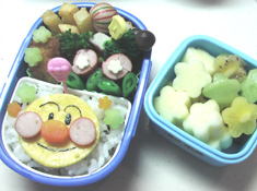 久しぶりにお弁当グッズを買った。それがこれこの型でいろんな食材を抜くと写真のようにかわいいお弁当ができるみたい♪不器用な私にでも、簡単に?できそう~♪(またまた自分勝手な勘違い~)で、早速使ってみた。食材がいつもと一緒では、あまり効果なし^_^;しかも抜くことに気を取られてご飯の上に置いただけだったのでBBが食べる時には、あちらこちらに散らばっていたみたい。帰ってくるなり「お花がバラバラだった~」とションボリ…とはいえ、この日もきれいに完食!BB、ありがとう~21日のお弁当先週の教訓。「飾り切りにした食材をしっかり固定すること」一つ一つ丁寧に固定するだけで意外に時間がかかるーで、肝心の挑戦したかったモノができずにタイムオーバー100均で購入した牛顔カップもおかずを詰めすぎてよくわからない~おかずもたくさん入らな~いBBを送り出した後、入らなかったおかずをC子ちゃんのお弁当に詰めてみた。無器用ながらもうずらの牛さん、挑戦してみた。blogのお友達のTomoyui*ちゃんが娘さん達のお弁当に入れられていたのを見てあまりに細やかな作りに、驚きと感動~C子が(私も)目を輝かせていたから・・・。お昼ごはん用に…と詰めたのにC子ちゃん、10時のおやつに食べたいと言う。時間がかかった細工飾りをC子ちゃん、一番最初に一口でパクリあっという間の完食でした~