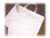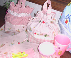 なんとか用意できました。娘の入園グッズ作り始めたのが遅かった~。春休みなどに始めることではなかったです。昼間はほとんど作業が出来ず子供が寝静まってから、ミシン カタカタ・・・でも子供の添い寝で一緒に寝入ってしまった日も度々写真によって色が違って見えるけれど実際の色に近い方がこちら↑もっと大人っぽい雰囲気にしようと思ったけれど一昔にBBの入園時に作ろうと(実際は実現できず)購入した生地がでてきたので今しか使えない柄・・・と思い、これを使用。かなりメルヘンチック(この表現って古すぎ?(^_^;))袋もナフキンも左側から作り始めました。ナフキンは、スプーンやフォークが入れられるように工夫してみたり、袋もレースリボン使ってみたりした。(でも面倒くさがって片側絞り)だけどBBから、色んなご指摘が。「この袋、閉めにく~い」「ナフキンにスプーン入れておくとC子はきっと落とすよ。」ということで2作目(右側)はシンプルな形のナフキンにし、袋も両側からギュと絞れるようにしました(^_^;)これ以外にも座布団カバーやら小物入れなどなどあれこれ仕上げました。私なりにも頑張って完成させた春休みの宿題ですこれ持って幼稚園に行くのも、もうすぐ。楽しみだね、C子ちゃん♪