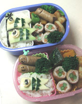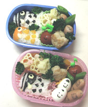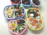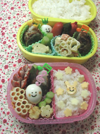 4日にBBの幼稚園の始業式があって今日から登園しました。C子の入園式(8日)まではお弁当持ちで1日保育。だけど月曜日の朝の我が家、食材が・・・あまりないの(co-op宅配が月曜日のお届けだから)昨日はうっかりして買い物に行かなかったのよね~今朝のお弁当はなんとか冷凍・冷蔵庫にあったもので用意しました。キャラでおかずをごまかしちゃった