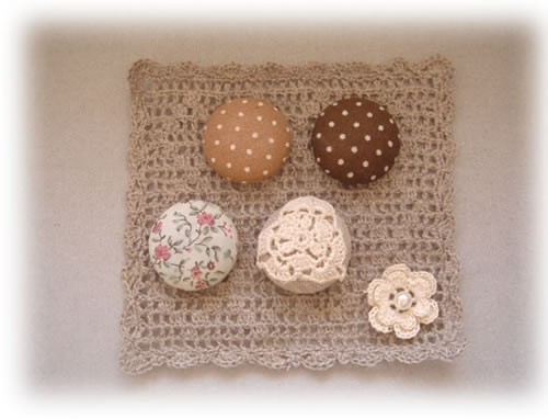 また前のブログから写真お引越し。100円均一のマグネットを布でくるんで、ナチュラルに変身。前のブログでいつもおじゃまさせていただいてた転勤妻の裁縫箱さんが作り方を公開していてくれて、私も作ってみたのですがこれは楽しかった!三角モチーフは編みました。あと下の四角のダイヤ模様ドイリーも。模様は濃い色の上だとよく見えます。この本の中から。ちょっとさみしいかったのでお花のモチーフとパールビーズつけました。この本は、とっても分かりやすかったし背景のインテリアがまたまたかわいくて作品数は多くはないと思うけど見るだけで楽しい1冊です。 Template- benio* Material- *MARIA