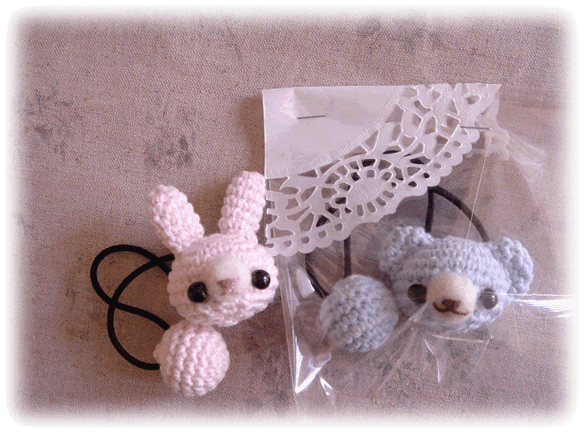 あみぐるみのヘアゴムを作りました。うさぎちゃんとくまちゃん♪アトリエでこちらの方の作品を参考にさせてもらいました!この間、毛糸のお店のピエロでいろいろ糸を買いました。 このシリーズをいろんな色買ったんですが、すごい編みやすかったです。 Template- benio* Material- *MARIA