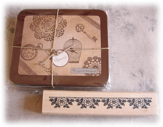 ドイリーのスタンプが欲しくて、いろんなの探してたらマーガレットスタンプっていうアンティーク調のかわいいスタンプのセットが欲しくなり迷わず買ってしまいました。もうひとつは長いレースのスタンプを一緒に購入。これもかわいい!おっきいドイリーの裏はこんな感じ。繊細で、消しゴムハンコではなかなかむずかしそう。クラフトの袋にドイリー小と、鍵のスタンプを押してみました。ちょっと薄くなっちゃったけど、いい感じ!これも、素敵~♪昔から、ハンコが好きで自分でも少し消しゴムはんこをかじってみたけどこれは、私の腕じゃ絶対ほれないしたくさん入ってて、すっごいかわいいしお得な気分です。私はドイリーを買いましたが、バテンレースのや、切手など違うシリーズもあります。見てるだけで楽しいです♪ Template- benio* Material- *MARIA