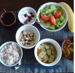 ( ´。`)スゥーーー・・・ (o´Д`)oオハヨォォォォ 今日はσ(´∀`●)ァタシの普段の食生活についてです。まぁ・・・一応、画像つけてみましたけど・・・まずは朝食から・・・ご飯(雑穀入り)・味噌汁(えのき・しめじ・わかめの赤だし)・野菜サラダささみとゴマ昆布の和え物・枝豆入りのはんぺんの煮物・バナナヨーグルト(冷凍ブルーベリー入り)・コーヒーいつもこんな感じの朝食です(*´・ω-)b ネッ! 昼食はお弁当を作って持っていったときのを・・・小さめのおにぎり2個・玉子焼き(電子レンジで作ります)ほうれん草の和え物(冷凍食品)・黒豆の煮物・野菜サラダ春雨スープ(坦々麺風味?)辛いものが食べたかったので春雨スープつけていますジム帰りにいつも飲むものですグレープフルーツジュースには疲労回復に良いと聞いたので・・・夕飯です・・・帰宅時間から就寝時間まで時間が短いので・・・たっぷり繊維を20g程度とカロリーOFFの豆乳で簡単に・・・<総括>基本的に夕食は帰宅時間から就寝時間まで時間がありません。最低でも就寝時間2時間前までに夕食を済ませたいので簡単な食事内容です。そのかわり朝食はしっかりと食べることにしています。昼食は外食の時などもありますがその時でもサラダだけは持参して昼食時間前に食べるようにしています。また、サラダをすべての食事のときは最初に食べるようにしていますまぁ・・・こんな感じの食生活です・・・一人暮らしなのでこんなところで簡便してください・・。・゚・(*ノД`*)・゚・。おいしくなさそうな画像ばかりですみません。o.゚。(・ェ・。`人)。o.゚。ゴミンネェ!!(。´Д⊂) ウワァァァン!