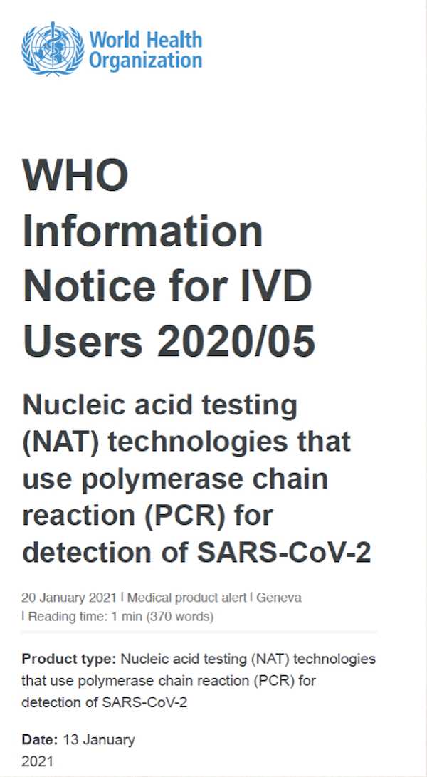 こうしたこともあり、WHO(世界保健機関)は昨年12月14日、PCRのCt値を高くしすぎないようにと通告。さらに、今年1月20日にはPCR検査は診断の補助手段であり、その結果が症状と合致しない場合は再検査するようにとしている。日本はこうした通告を尊重しているのだろうか?