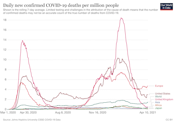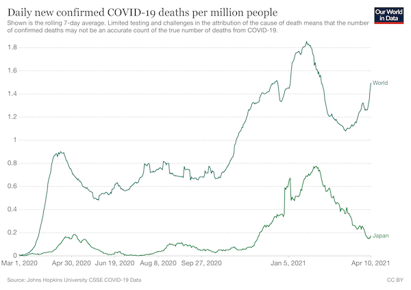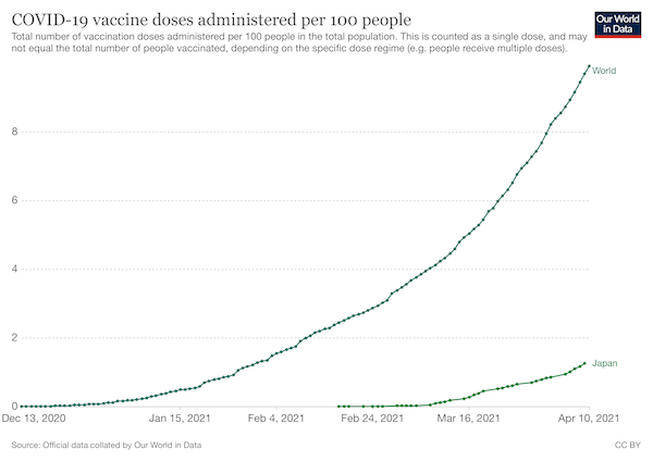 発表されているデータを見ると、実際、日本のワクチン接種者数は増えている。ところが「COVID-19による100万人当たりの死亡者数」は2月から減り続けている。「死亡者数」の信憑性に問題はあるが、それでも操作が容易な「感染者数」を見るよりはましだ。