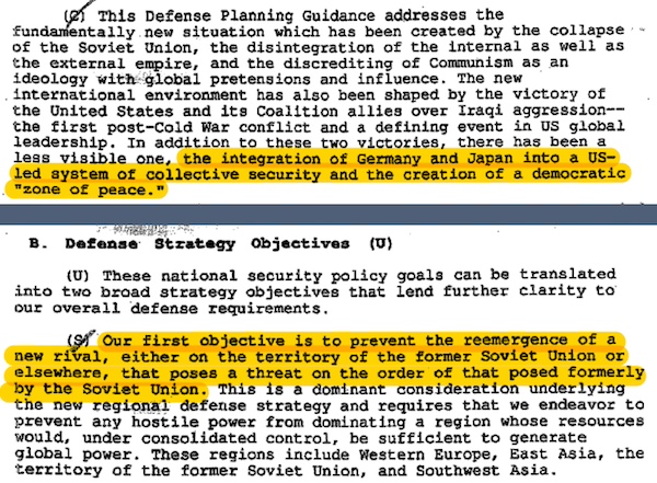 このプロジェクトの目的は新たなライバルの出現を防ぐことにあり、その対象には旧ソ連圏だけでなく、西ヨーロッパ、東アジア、西南アジアも含まれている。ドイツと日本をアメリカ主導の集団安全保障体制に組み入れ、「民主的な平和地域」を創設するともされている。つまりアメリカは日本を自国の戦争マシーンに組み込むと宣言したのだ。