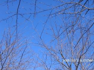 青空に枯れ枝清少納言は‘冬はつとめてー’と歌っていますが、冬の朝、空が本当に澄んでいます。私はよく朝からキッチンでコトコト煮炊きものをします。そうすると、子供が起きてくる頃には、部屋の窓一面が蒸気で曇ってしまいます。パジャマのまま、手形、足型、ガラス窓いっぱいにつけてはしゃぎます。あぁ、また窓ふかなくちゃ。