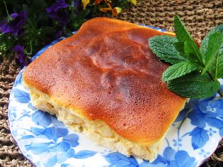 4.3のメレンゲを加えて混ぜ、型に流し180℃のオーブンで湯せんで30分焼く。