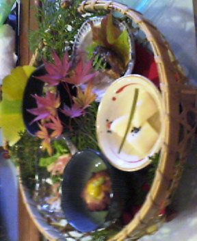 ひとつはおおーきな器に盛られて、もうひとつはかごに小鉢がたくさん入っているタイプ。もみじなんかも飾ってあって、見た目はとってもインパクトがあります。