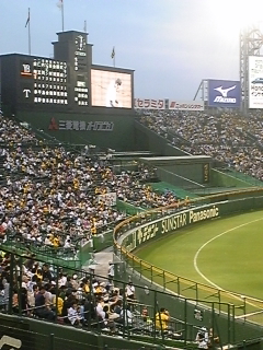 皆さん!アンニョハセヨ、かつ・ビョンです。久し振りの日記更新です。週末は野球三昧の為、皆さんのところにも訪問出来なくてミヤネです。でも、キチンと訪問しますので見捨て無いで下さいね7月3日、今シーズン初めての甲子園、リニューアルして初めての甲子園をリポートしたいと思います。出発前から降りだした“夕立やろ!”って思い阪神甲子園駅に到着は止まず、嫌な天気。甲子園と言えば、“ツタの葉”が有名で球場の周りをツタの葉に覆われてたんですが全く無く綺麗に舗装されてましたテレビを見られた方は御存知ですが、バックネット裏にある電光掲示板。選手がバッターボックスに入ると、選手の目の部分が出てくるんです。今回、大きく変わった所ですね。 しかし相変わらずの。吾輩は、ズブ濡れ。愛息は、雨合羽を買いなんとか濡れずに。試合は、ブラゼル選手のホームランもあり阪神の有利な展開。球場に行くとも進み…これは、ちょっと失礼しました。以前は汚く狭い為、かなりの長蛇。少し離れた場所で、焼き鳥を焼いてる為、トイレと焼き鳥の匂いが立ち込め“THE甲子園”って感じでしたね。トイレも綺麗になり、分煙もしっかりされ本当に良かったですね。甲子園の名物、“ジェット風船”も再開。この頃になるともすっかり止み、阪神も追加点をあげムード最高!!甲子園では、焼き鳥が有名で一本350ウオン。カレーと焼き鳥はお勧めですね。吾輩も、アニキ金本の撮影に必死。 試合は、7対1で阪神の大勝。でも、甲子園で六甲颪歌ったのいつ以来かな?? 球場の外では“タイガースショップ”があり、お土産もどうですか??久々の甲子園。阪神も大勝で最高でしたね。皆さんも一度どうですか??♪“野球場に連れてって”♪では無いですが、本当に生は、良いですよ。