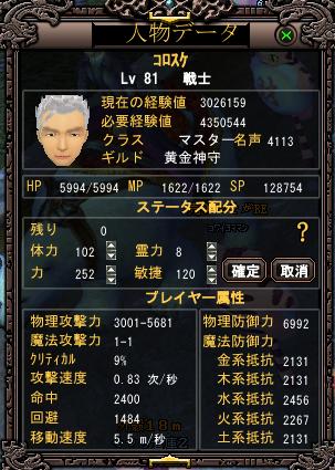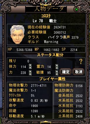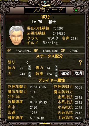 とりあえず、79でのステはこんな感じです↓拳装備すると、命中は3k近くになるのですけど、攻撃が2kくらいになってしまいます^^;拳と斧両方装備できるようにすると体力が全然振れないですね^^;79Dで壁できる戦士募集とかあるのですけど、簡単に即死していまいそうでなかなか入る勇気がありません^^;今は60拳装備までしか出来ないですけど、今後もっと敏捷あげるかは迷いますね。ソロでちまちま遊んでる分には今の拳でも十分かな~って思いますけど、レベルに合った拳を装備しようとすると、体力初期値にしてもギリギリかもしれません。まー基本斧装備なので、拳はこのままで良いかな~って思ってます。今の拳武器がMP吸収なのですけど、出来ればHP吸収が欲しいです^^;そうすると、もう1段階上の装備。。。敏捷足りない。。まーそこまで拘らなくでもいっかな。。全部の武器を使い分けるなんて無理あるでしょうし、実際拳スキルで有効なのが、ドロップキックくらいだと思ってるので、斧外せば済むことなんですけどね^^;今夜泣で狩りするときは、拳で1対1です。斧範囲でガンガン狩った方が経験は良いのですけど、札消費も激しすぎるので、しばらくは拳を堪能したいと思います。とりあえず、拳マスタリーだけはMAXまで上げてみようかな~なんて考えてます。通常攻撃のスピードが結構新鮮で楽しいので。。。。w