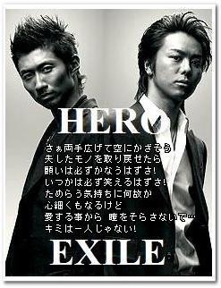 どうも、みなさんこんばんはEXILEのアルバムのお陰でバイトの疲れが吹き飛んでもうヤバイくらいテンションTAKAHIROになったEXバカですYO(笑)はい。みてのとうり分かりやすいくらい元気になっちゃいましたそして、更新ご無沙汰してしまい申し訳ッなんか、いろいろとテンションがだったんですが・・・もうテンションTAKAHIROになちゃったのでご心配なく★・・・で、アルバムのエグザムライから見たんですが・・・。なんですかあれはなんかジャンプアニメであってもおかしくないくらいかっこよかったんですけど・・・しかも途中で「まるちょん」が・・・USAァァァァァァ前にも言いましたが、「まるちょん」はUSAのパピ~とマミ~がやってる居酒屋なんです☆しかも、24karatsのお店の旗もありましたねもうテイションTAKAHIROPVはもう相変わらず良すぎでヤバイですオススメは『 Eastern Boyz'N Eastern Girlz 』そしてもちろん『SUPER SHINE』もですよ★makingは『 Touch The Sky feat. Bach Logic』がオススメです歌のほうはENTERTAINMENTが詰まりすぎの曲ばかりです私のオススメは、『MY FANTASY』、『New Jack Swing』、『My Buddy 』です☆★ヤバイです(笑)とまぁ、言葉では言い表せないくらいヤバイですみなさん是非、手に入れてみて下さいそれでは、テレビ情報7月26日(土)21時~のNHK MUSIC JAPANにEXILEが出演するそうですよ歌う曲は「SUPER SHINE」と「24karats」の2曲です7月26日(土)フジテレビ「ミュージックフェア21」にEXILEが出演時間は18:00~18:30です7月27日(日)「中間発表 第41回日本有線大賞」にEXILEが出演TBSテレビ 14時~15時24分です「SUPER SHINE」と「24karats」の2曲ですですこの2日間は忙しいですよそして、きました『EXILE BALLADE BEST』は12月発売決定★☆極上のバラードですよそれでも必ず また人を愛す・・・・・涙がちょちょぎれてきますね・・・発売が楽しみですそれでは、画像貼ります★☆では、さよならぁ~