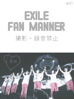 どうも今日はどうしても書きたいコトがあったので更新しましたそれは・・・最近EXILEファンのマナーが悪いと言われてるそうです。金スマの収録のトキも携帯で撮影したりしてた人がいたみたいですということで、マナーを守っている人はこんなコト言われるの嫌だと思うので、マナーを守っている人も、守っていない人も、どうかご協力お願いします今ちょうどライブもやってるし・・・EXILEファンは悪い人じゃないってトコ見せつけてやりましょう