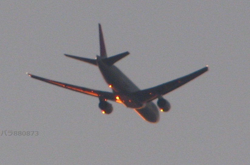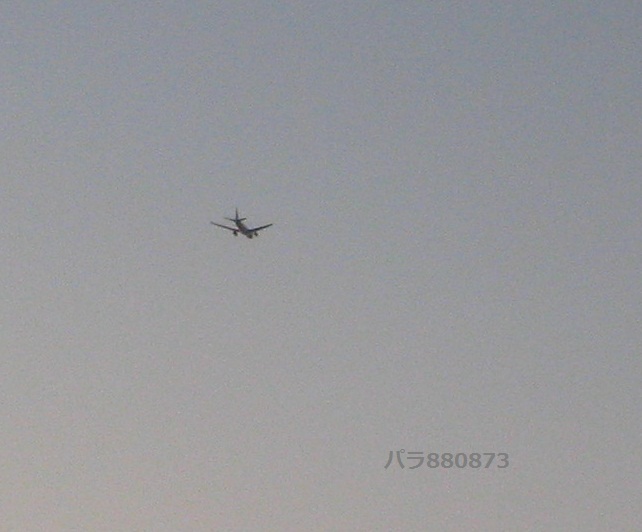 羽田発国内線の旅客機が夕焼けを受けて飛んで行きます。