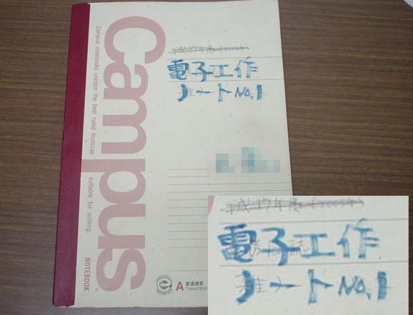 プライベートな話ですが・・・仕事の記録をちゃんとつけようと思って平成17年度業務日誌,というのを作ったのですが,まったく書かずに終わり,とりあえず雑多な記録でも,と思って雑ノートに書き換えたけど,これも尻切れトンボ.そこで,電子工作ノートNo1にして2008年1月から電子工作の記録をつけ始めました.PICやH8やマイクロマウスに関して勉強したことをいろいろ書いていたら,約半年で1冊終わりました.記念に写真をのせておきます.表紙↓マイクロマウスのスラローム走行・斜め走行を考えてるページ↓