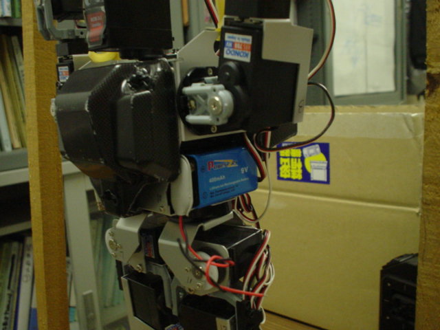 今日の午後,数時間空いたのでそれから今までKHR-1HVの自律化基板の製作をしました.DIP-SWで手ごろな大きさのものが無かったので強引にカット.今日作った基板.メイン基板の回路構成は,モータ駆動回路を省いてハーフサイズマイクロマウスの回路とほとんど同じです.基板の裏面.右脇に仕込みます.固定用の部材も着けました.電池は左脇.マジックテープで取り付けます.あと2-3日時間が取れればハードウェアはできそうです.KHR-1HVコントローラーセット