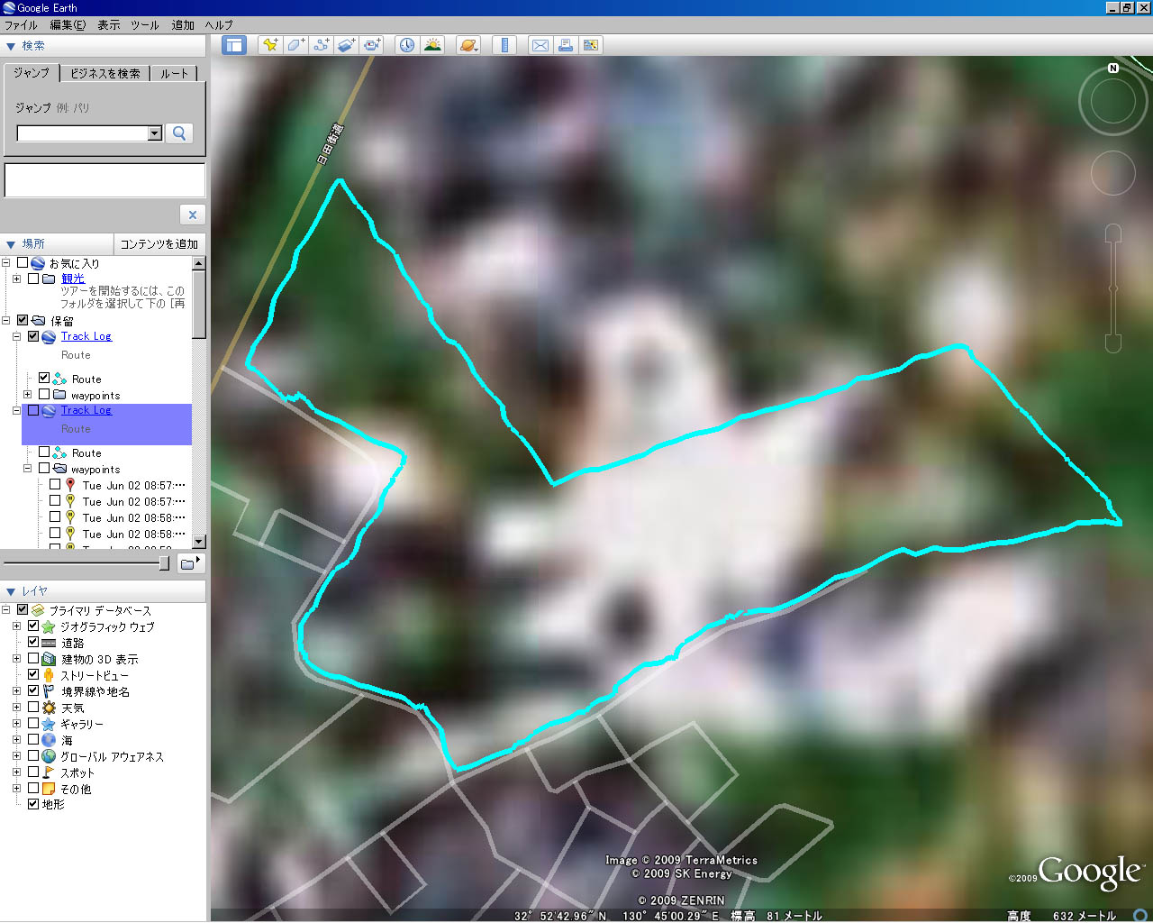 田舎の学校なので,GoogleEarthの解像度が悪いです.学校の輪郭がわかるように,朝からウォーキングしてみました.それと,グラウンドに星を一筆書き.[即納]値下げ!【送料・代引手数料無料】【LCD画面付き!GPSデータロガー】M-241 GPSロガー【ポイント2倍!】