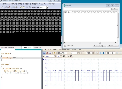 昨日の続き。素直に動かないのでオシロで信号を確認。信号なしの場合、ミリ秒オーダーのノイズがひっきりなしに出てる。これにシリアル信号乗せても判別できるはずがない。おもいっきり速度を下げて300bpsで大文字の”U"、コードはバイナリで01010101を連続して送ってみると認識されたのがこちら↓速度を倍の600bps以上に上げると、信号にこんな風に隙間が開く。(この間にノイズが入ったらダメになるかもしれない?)1200bpsだと、信号の最初がなまって読み取れない。つまり、300bpsまたは600bpsでソフト的に送り方を工夫してエラー処理を行えば送信できそうではあるけど、やっぱりちょっと面倒。