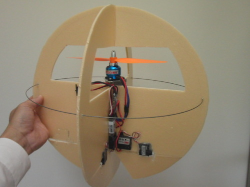 プロペラ反力を打ち消さず、自転したまま操縦する自転式飛行体の製作途中。円板を2枚組み合わせた球形飛行体にして機体をプロペラガードにして安全性を高めました。マイコンを組み込む前の安定性を見てる動画。スロットル操作だけでおおよそ同じ範囲で漂っています。リポ400mAh3セルで7分弱回しっぱなしです。安定性も安全性もあり作りやすいので、この形をデフォルトにしようと思います。その動画→ 自転式球形飛行体のベース、試験飛行--追記--マイコン搭載完了!自転式球形飛行体、尾翼の制御 を動画に撮影しました。飛行中に機体が回転するのですが、機体の回転に合わせて尾翼を同一方向に傾けることにより任意の方向への移動を可能とします。