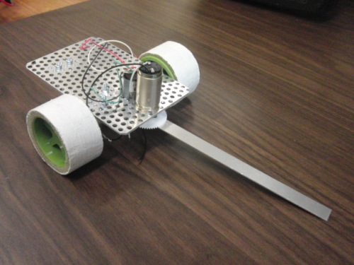 今年の学生F君は頑張っています。1号機と違うコンセプトで作ってる機体のおおまかな形ができてきました。最終的には200-250gの機体になりそうですがパワーはあります。裏面↓ モータはギヤ付きのコアレスモータを3個、タイヤとセンサ振りに使ってます。センサの角度と走行距離を2相エンコーダで読み取り、モータのパワーにフィードバックして走らせます。--追記--バッテリーの収納と、基板の外形加工まで出来ました。本体ができたので、次は回路の製作。