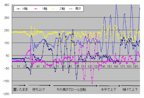 先日作ったセンサの応用に簡単な実験。卓球を5年くらいやってた人(自分)のヘソ前にセンサを付けて素振りした時のセンサの値をログにとってグラフ化。分析してみると、こんな感じ↓結構簡単におもしろいデータが取れそうなのでちゃんと研究してる人いそうだなぁ、と思って検索したらいらっしゃいましたので、ブックマークしておきます。例えば↓http://www.rcp.keio.ac.jp/sip/technic_patent/technic/doc/ohgi.pdfhttp://toragi.cqpub.co.jp/Portals/0/backnumber/2010/10/p172.pdf学校の部活の指導用などに、安価に組み込めるといいですね。