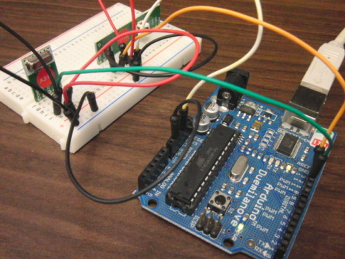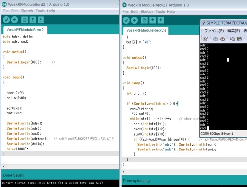 昨年度に買ったこれ↓http://strawberry-linux.com/catalog/items?code=82003http://strawberry-linux.com/catalog/items?code=82004使ってみました。まずは、Arduinoから、デジタル信号を周期的にON-OFFさせて無線で送信、同じArduinoで受信してLEDを点滅させてみました。目視だと問題なく点滅してる。ただ、微妙にノイズが乗ってる感じがするかも。次に、USB-シリアルポートを使ってシリアル信号を無線で送信、Arduino側で受信うまくいかない、(削除)何も送らなくても不規則な値のら列を受信し続けています。やっぱりノイズを適当に解釈して受信し続けているようです。やはり、シリアルポートを直接使って送受信することはできないようです。プログラムでノイズを判別して、誤り検出を含めてデータ送受信する必要がありそうで、ちょっと面倒ですね。-追記-昨日は、信号が反転しているかもしれないのでトランジスタ1石で反転してみたって書きましたが、反転してるわけではなかったのでその部分を削除しました。