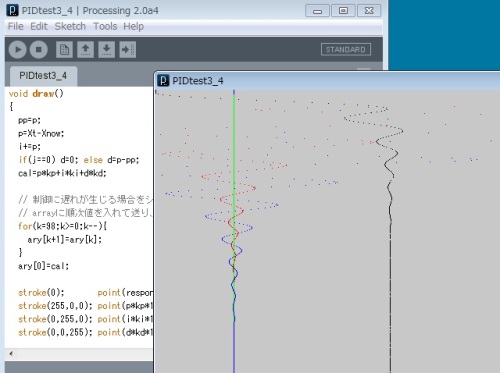 理論的には解くのは自分の頭では無理なので、PIDのパラメータを適当に探す感覚を磨くために、processing で簡単なモデルで応答の遅れのある場合のシミュレータを作って、パラメータを変えながらうなずいてみたりしてました。