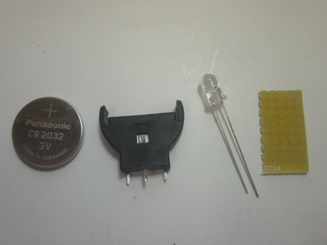 Make Tokyo Meeting で、電池に自己点滅LEDを挟んだだけの物を頂いたのですが、あるイベントで簡単な半田付けを伴った工作を企画して欲しいと言われて、ハンダ付けを入れて作ったものです。材料はこれだけ↓裏面で電池とLEDをはんだづけしただけです。電池ケースに電池を抜き差しできるので、不要な時は電池を外しておけます。