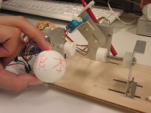 ピンポン玉など球体用プリンターの自作。ソフト担当のY君くんがちゃんと動かしてくれました。その動画→ ピンポン球ロボット、文字かけましたオープンキャンパスなどでデモに使いたいと思います。