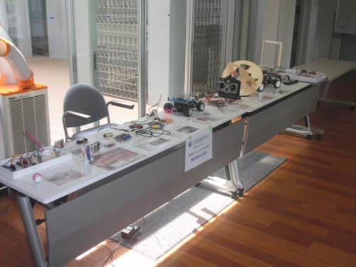 今日の午前中は、学校で授業見学会があったので、手軽に持ち運び出来るものを玄関ホールに展示してきました。ピンポン玉に字を描く球形プリンタは結構人気がありました。