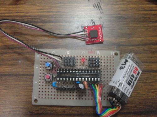 ハンダ付けできた。Arduino-IDEを用いた飛行体の基板で、プログラム書き込みのシリアル通信のピンヘッダ。飛行時にはGPSを接続。R/C受信機読み取りと反対側にサーボ出力。I2C通信でセンサ読み取り、残りのアナログ入力4ポートを拡張用。スイッチとLEDをを1つずつ。このパターンがだいたい固定化してきたので、基板を焼くかCNCで削るかな。
