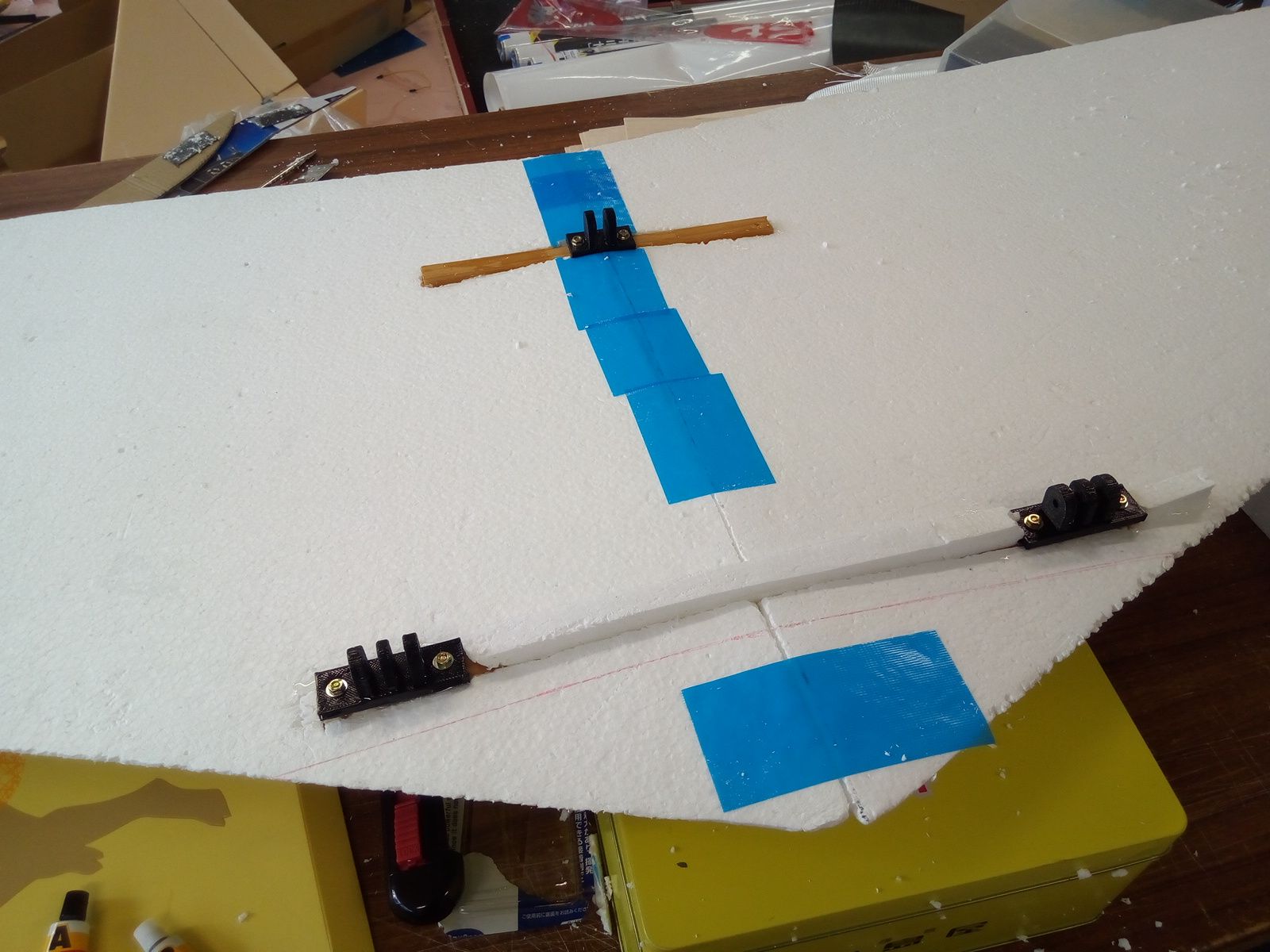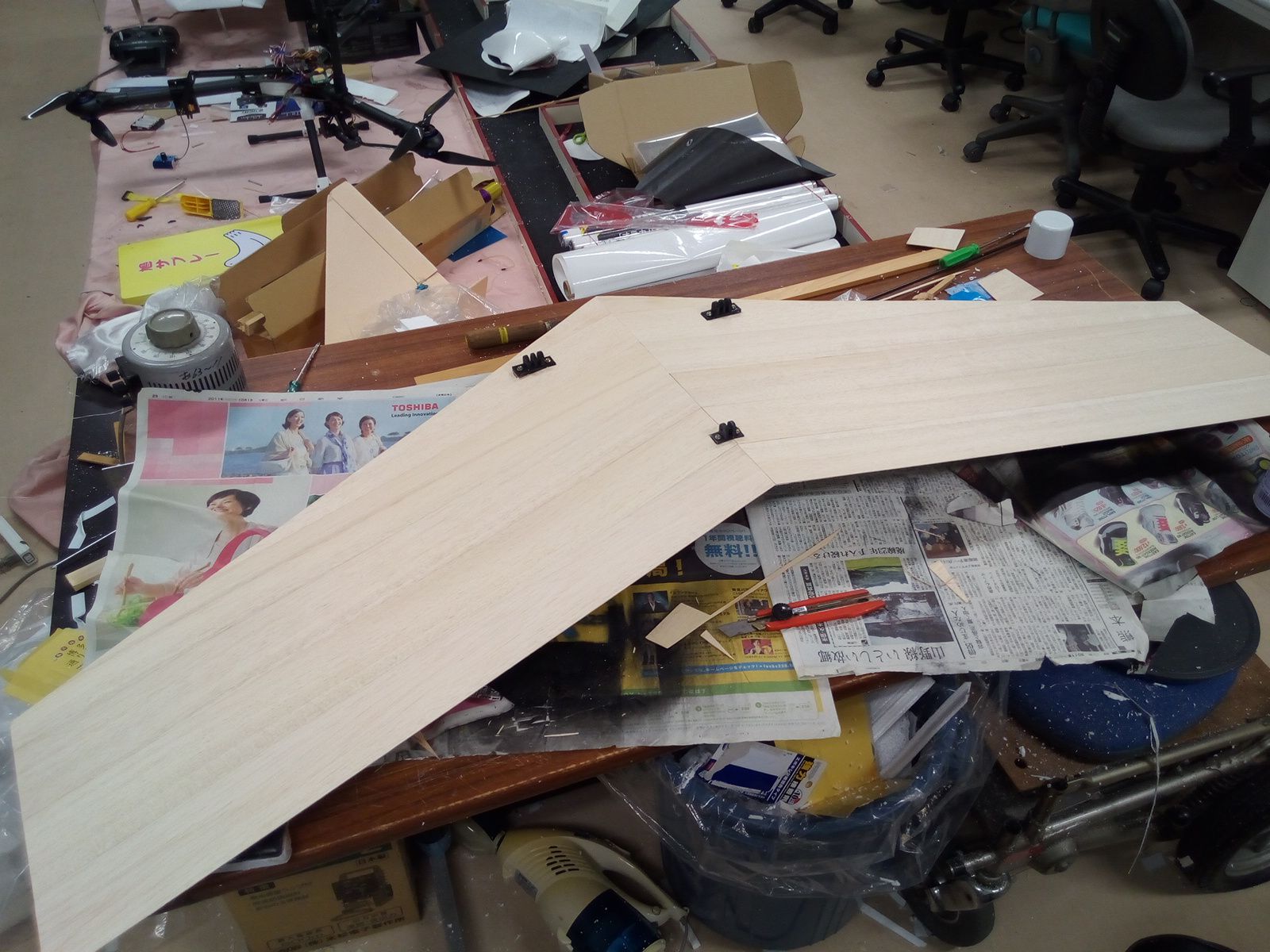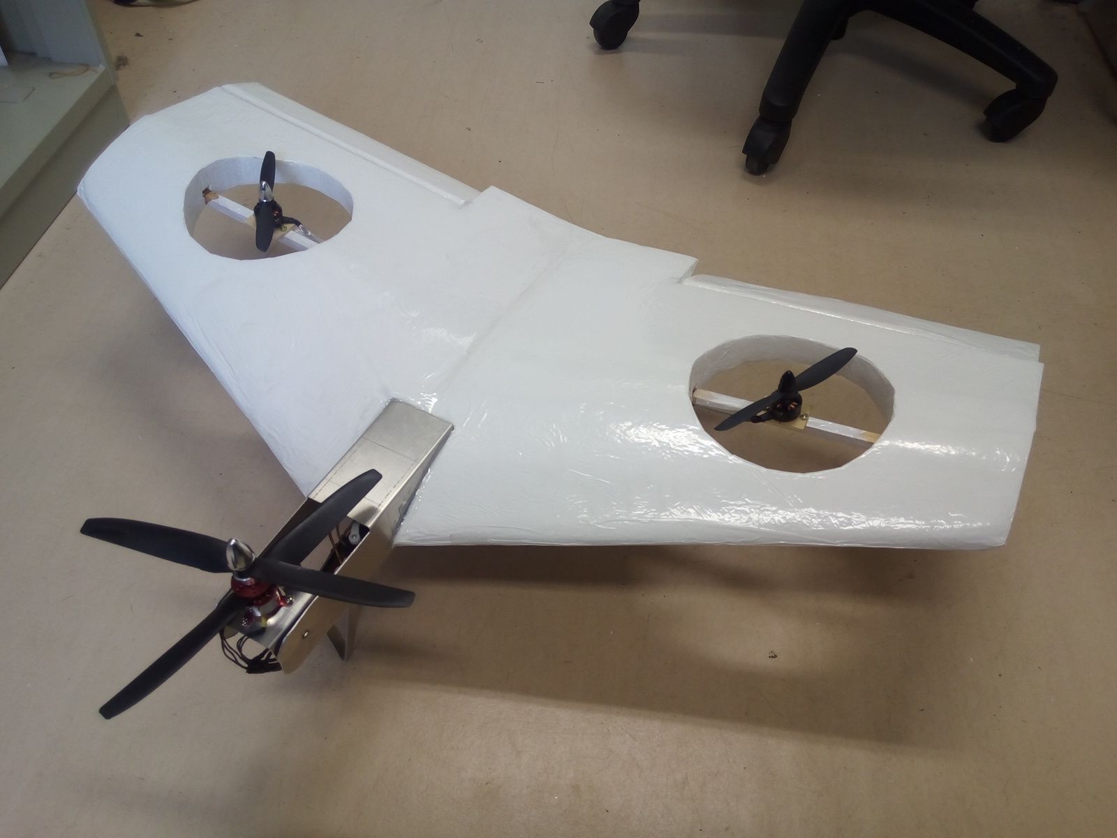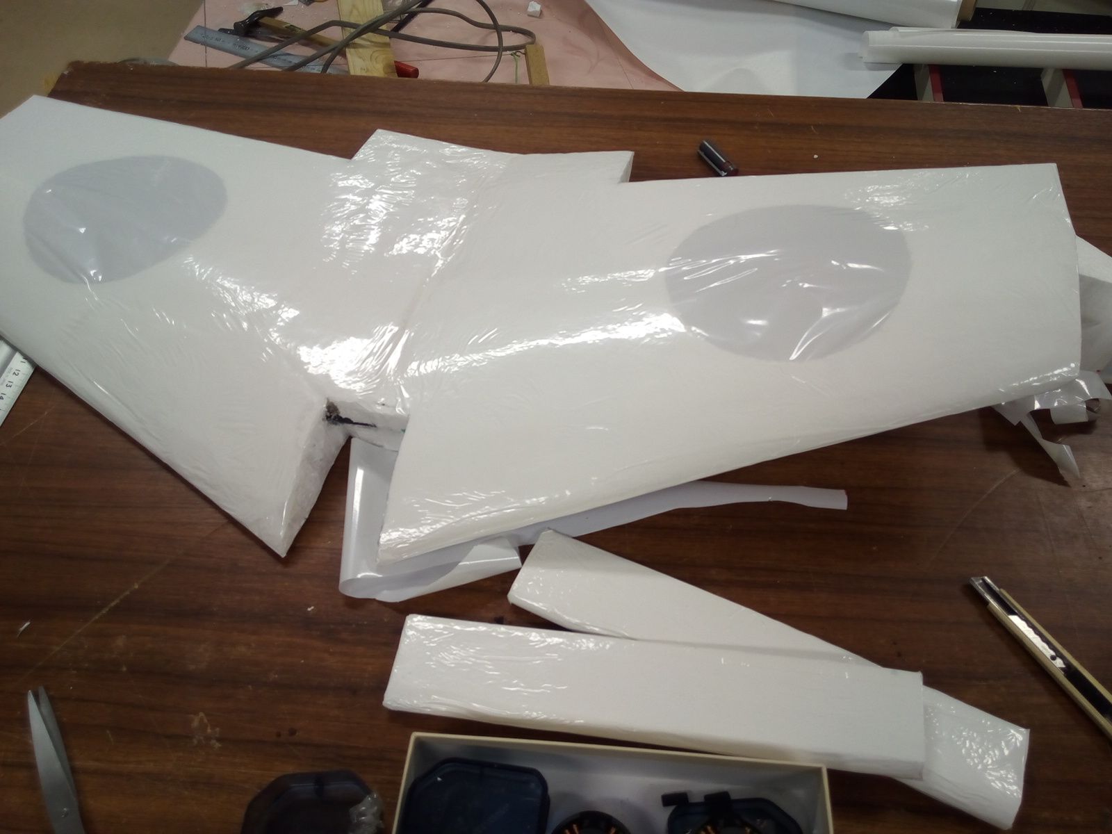 同時並行で作っているVTOL機の進捗.発泡スチロールで切り出した翼にフィルムを張りました.こちらもだんだんと出来上がってきた.